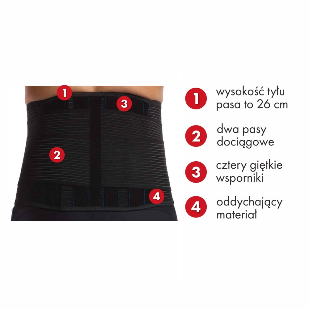- cztery giętkie wsporniki - umieszczone na tyle pasa wsporniki dopasowują się do anatomicznej budowy kręgosłupa. Zapewniają wsparcie w dolnej części pleców.